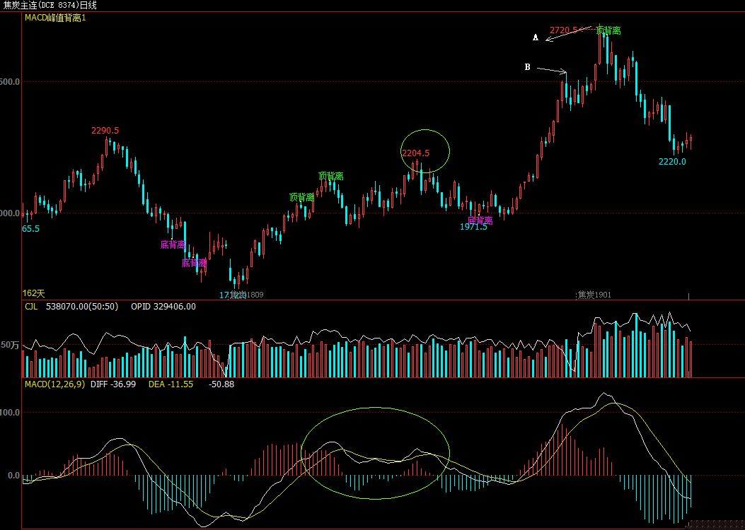 如果本段红柱包含这样两次创新高,价格更高MACD柱体缩短,定义背离进行标注给您一个编写参考: