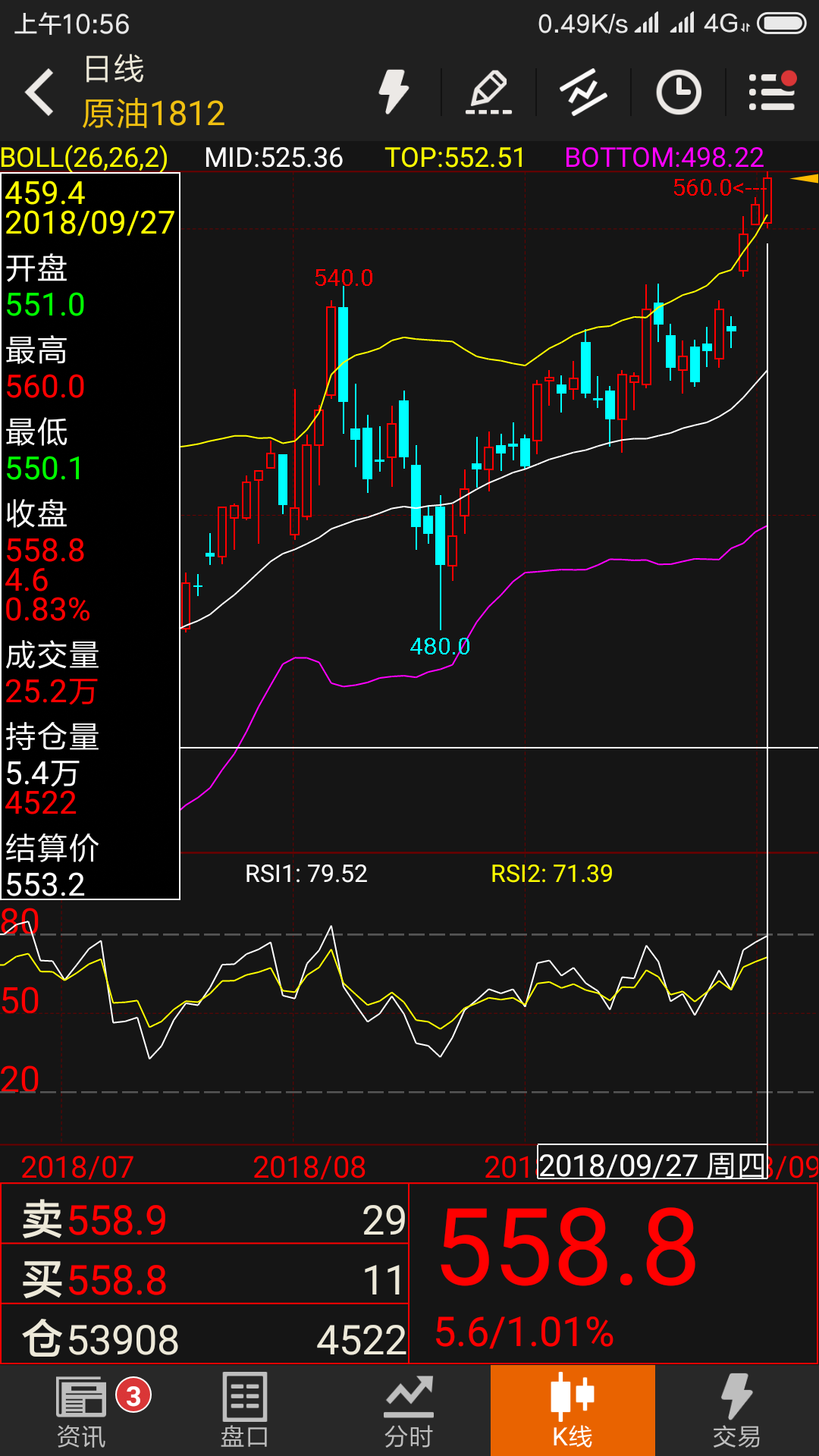 老师请教个问题 (文华财经随身行Android 5.4.7(240))投资者咨询:老师请教个问题 (文华财经随身行Android 5.4.7(240))来源:文华财经 日期:2018-9-27 10:59 老师请问这个持仓量4522是什么意思?还有持仓量红色和绿色有什么区别? 文件名:Screenshot_2018-09-27-10-56-03-582_com.wenhua.bamboo.png技术人员回复日期:2018-9-27 11:01 是与前一根K线比较变化数值 红色表示增长,并且增长了4522,绿色表示减少 您理解下