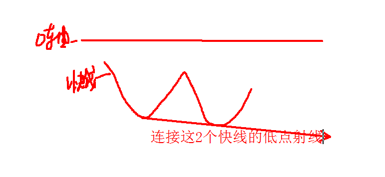 macd在0下,快线至少连续5个周期都是向下,下一个向上,连接2个快线的最低点射线,谢谢