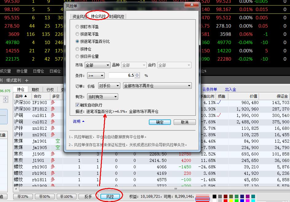 wh7怎么设风控呢? (文华财经wh7睿期)投资者咨询:wh7怎么设风控呢? (文华财经wh7睿期)来源:文华财经 日期:2018-10-25 15:14 譬如亏损达到5%,就限制开仓这类技术人员回复日期:2018-10-25 15:20 下单板》风控单,在这里可以按照持仓来设置风控管理