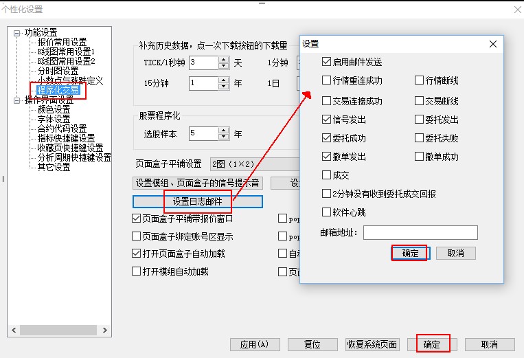 软件右上角 系统工具》个性化设置》程序化交易》设置日志邮件,参考截图启用后勾选需要的提示项目即可
