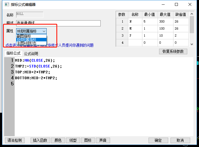 参照截图,设置指标属性为K线附属指标,点击确定加载