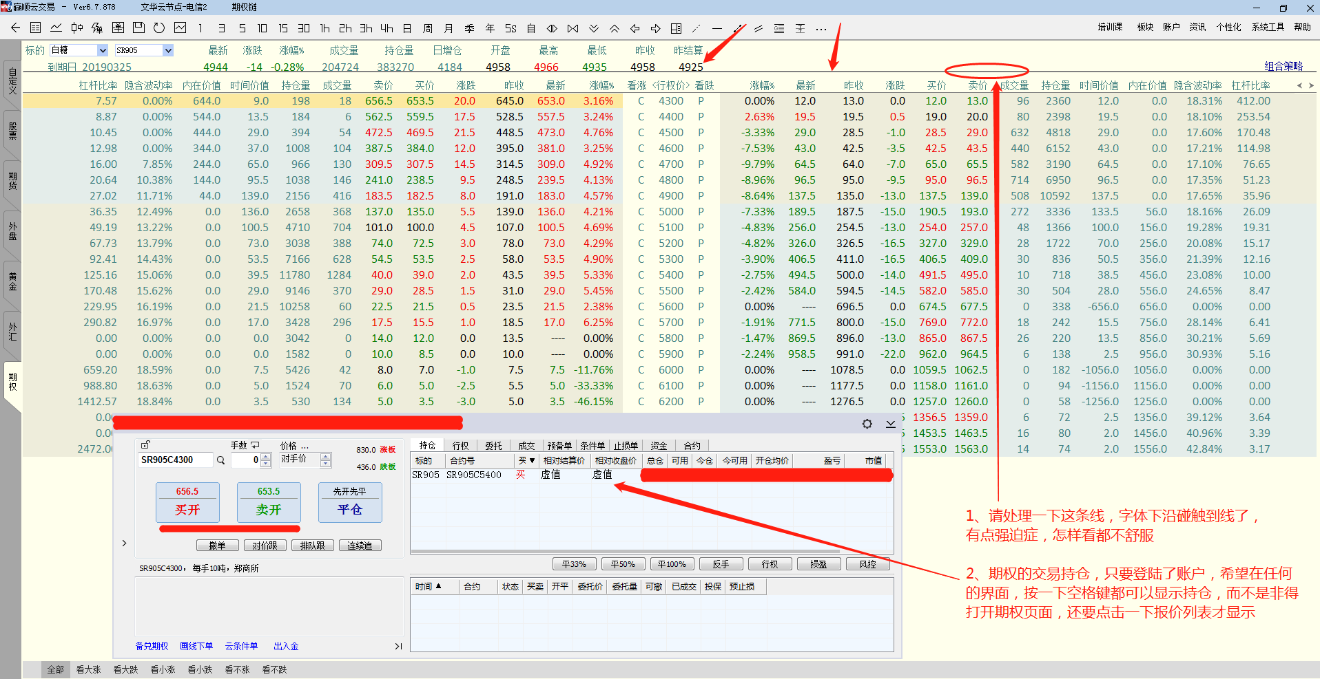 2、期权的交易持仓,只要登陆了账户,希望在任何的界面,按一下空格键都可以显示持仓,而不是非得打开期权页面,还要点击一下报价列表才显示