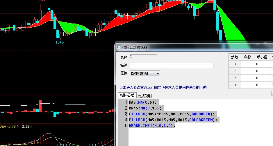 FILLRGN(MA5>=MA15,MA5,MA15,COLORRED);