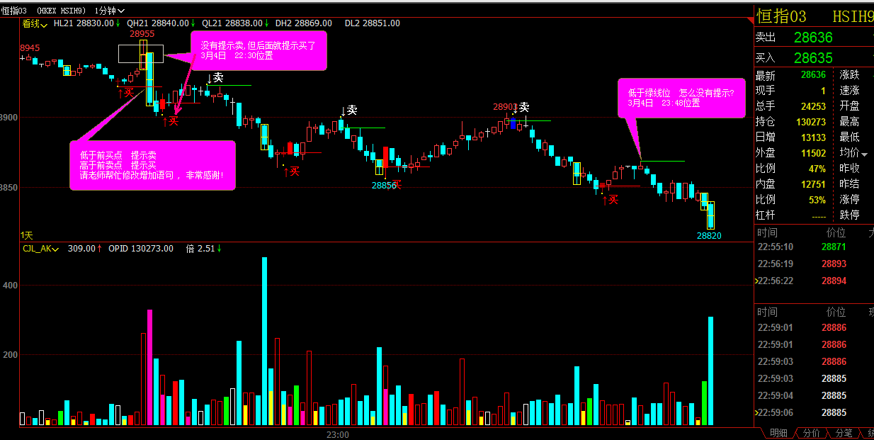 请老师帮忙修改一下语句,要求:高于红线提示买,低于绿线提示卖