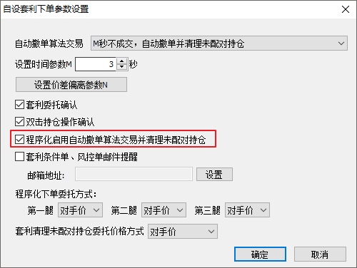 套利一腿被撤单 (文华财经wh9)投资者咨询:套利一腿被撤单 (文华财经wh9)来源:文华财经 日期:2019-3-5 10:33 在MQ中,一腿被自动撤单,是什么原因引起的技术人员回复日期:2019-3-5 10:54 为了防止瘸腿,套利是有自动撤单算法交易的 默认方式为N秒不成交,自动撤单并清理未配对持仓,您可以自行设置 软件右上角》账户》自设套利下单参数设置投资者咨询:套利一腿被撤单 (文华财经wh9)来源:文华财经 日期:2019-3-5 10:33有没有一个功能,M秒不成交就追单。技术人员回复日期:2019-3-5 13:30 和单合约一样的,N秒不成交追价在指令中编写追价的委托方式就可以了 例如:Buy(DefaultVol,Tracing_Order);//委托默认手数,委托方式为自动连续追 第一次委托使用追价首次下单设置的方式委托,在追价参数中设置的N秒没有成交,会触发追价