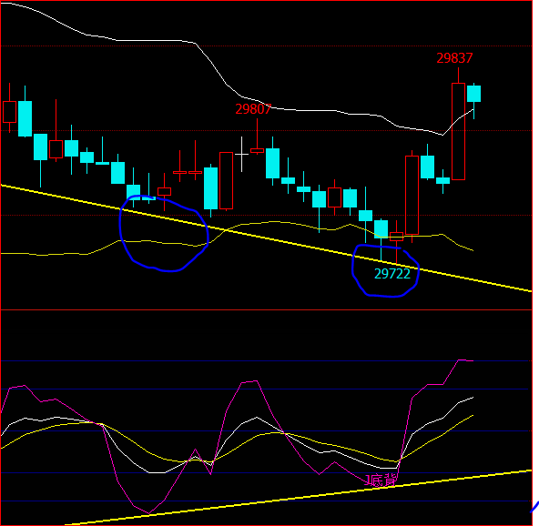 不要等到后面的价格刷新高再提示背离 <个人的思路是当价格刷新低29722比前面低的时候,KDJ的J值没有比前面的J值低,反而走高,J值立即发出背离,而不要等到K线价格比前面29807高的时候才发出J低背离信号的>