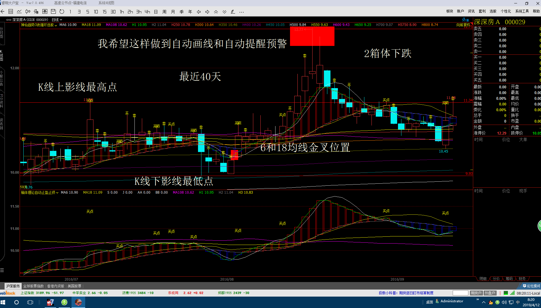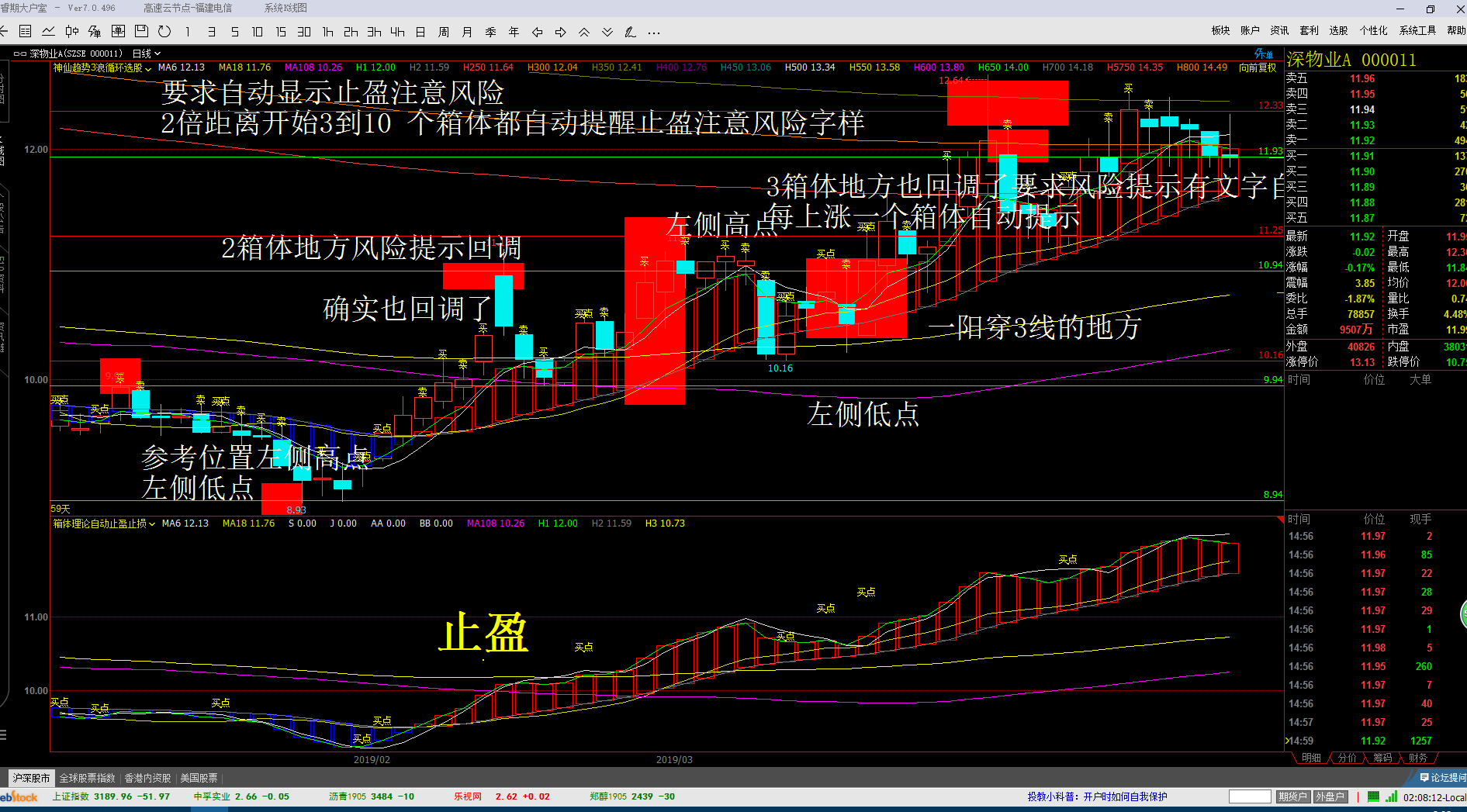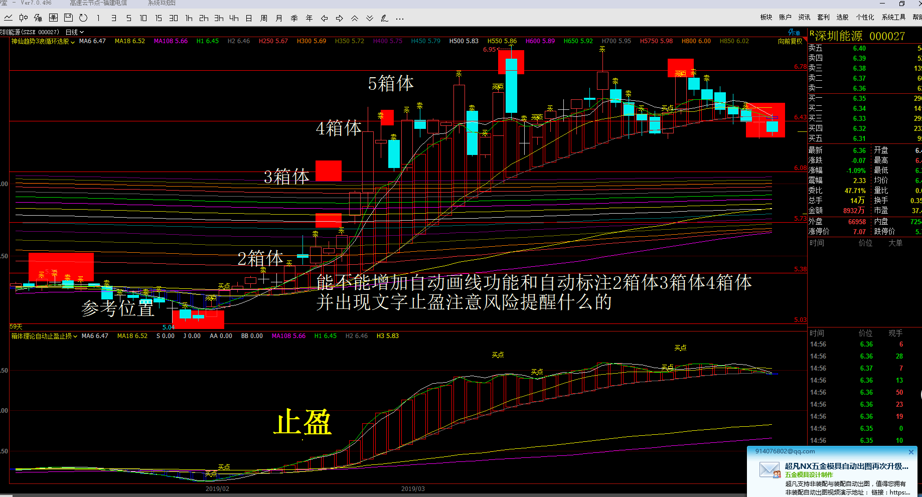 向上突破左侧最高点,左侧突破前的低点和高点向上2倍距离3倍4倍5倍6倍7倍8倍9倍10倍地方自动出现自动止盈字样并预警字体大一些并醒目