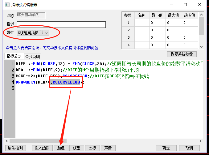 MACD:=2*(DIFF-DEA),COLORSTICK;//DIFF减DEA的2倍画柱状线