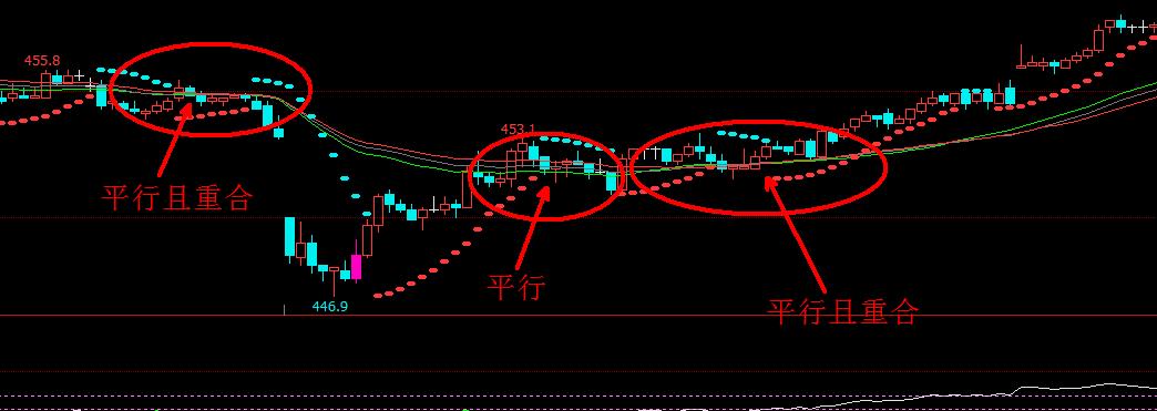 注意:若不能同时满足5个条件,判为震荡行情,A,B 线变黄色