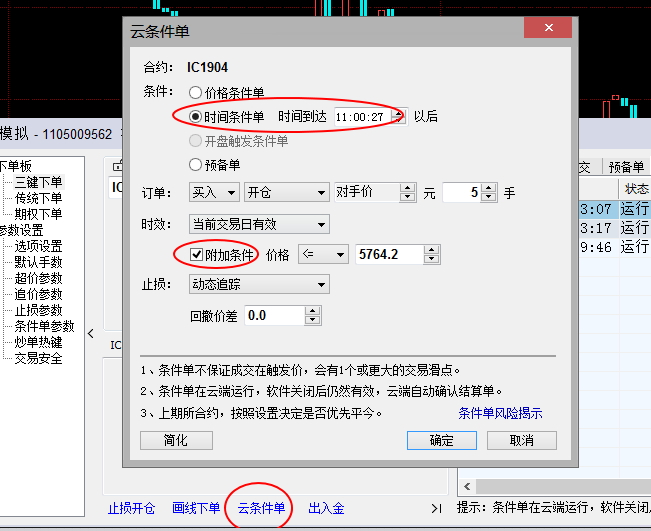 [讨论]关于云条件单的建议 (文华财经WH6赢顺V6.7)投资者咨询:[讨论]关于云条件单的建议 (文华财经WH6赢顺V6.7)来源:文华财经 日期:2019-4-15 10:53 我经常用云条件单,不知道能不能有个快捷键,能够调出页面。还有在设置里面,时间条件和价格条件能不能合并。比如我想等某个k走完,那么就要设置某个时间后启动,同时我要设定突破后回调某个价位。。如果合并就好了。要不就只能设置一个技术人员回复日期:2019-4-15 10:55 1.条件单没有快捷键,空格键调出下单板进行设置就很方便的2.您可以设置时间条件单,附加价格条件单当时间满足后,再满足价格条件就会触发的 文件名:图像 4.jpg