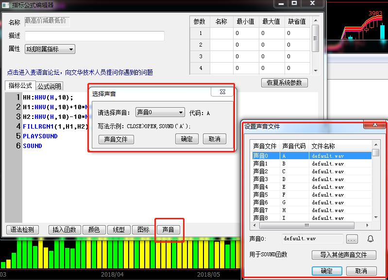 有没有第三种声音提示 (文华财经WH6赢顺V6.7)投资者咨询:有没有第三种声音提示 (文华财经WH6赢顺V6.7)来源:文华财经 日期:2018-8-23 20:08 怎么搞第三种声音提示技术人员回复日期:2018-8-23 20:14 您是自编的指标进行声音预警吗?自编指标使用SOUND或者PLAYSOUND声音代码可以参考下图位置插入的具体每一个声音代码对应的声音文件,也可以单独设置的
