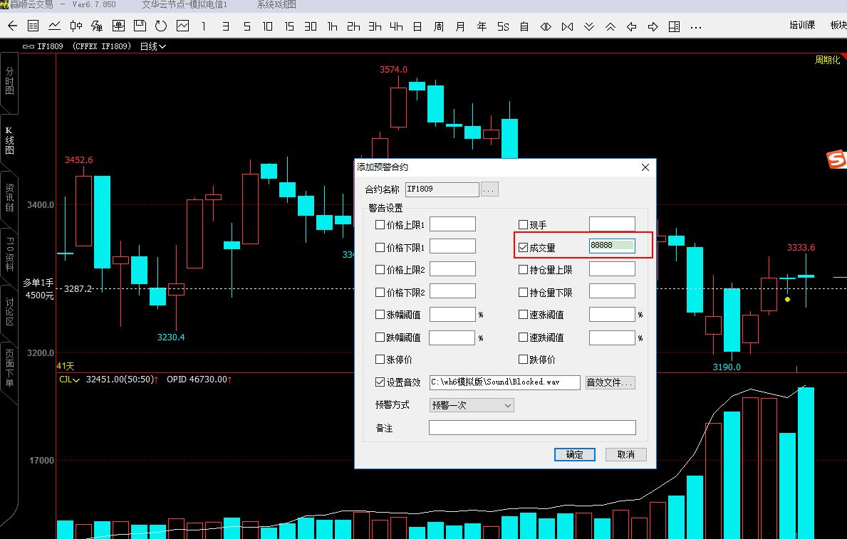 成交量划线预警 (文华财经WH6赢顺V6.7)投资者咨询:成交量划线预警 (文华财经WH6赢顺V6.7)来源:文华财经 日期:2018-8-23 16:29 老师, 请问可以类似 " K线的 对某一合约 划线预警", 对成交量 预警吗? 技术人员回复日期:2018-8-23 17:01 画线预警仅针对价格的关键点位进行预警的 需要对成交量预警,可以在右键》价格预警》设置针对成交量上限,触发后会给您弹窗提示的投资者咨询:成交量划线预警 (文华财经WH6赢顺V6.7)来源:文华财经 日期:2018-8-23 16:29 其实是想对CCL这个指标做预警. 技术人员回复日期:2018-8-23 18:53如果需要对CCL等技术指标进行预警,您可以考虑使用wh7软件的公式预警来实现 自编公式预警指标,当指标返回值超过一定范围,给您弹窗、闪屏与声音的提示,您了解一下 wh7公式预警说明:http://www.wenhua.com.cn/new_guide/Wh7/view3-4.html wh7官网:http://www.wenhua.com.cn/
