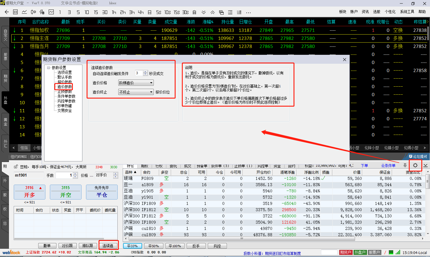 下单时怎么让自动连续追价 (文华财经wh7睿期)投资者咨询:下单时怎么让自动连续追价 (文华财经wh7睿期)来源:文华财经 日期:2018-8-23 15:08 下单时怎么让自动连续追价技术人员回复日期:2018-8-23 15:20 追价,是在单子没有成交的情况下,撤单以更有利的价格重新发委托 下单的时候是设置不了的,只有当合约未成交时,才可以在挂单栏选择合约进行追价 追价参数截图所示设置: