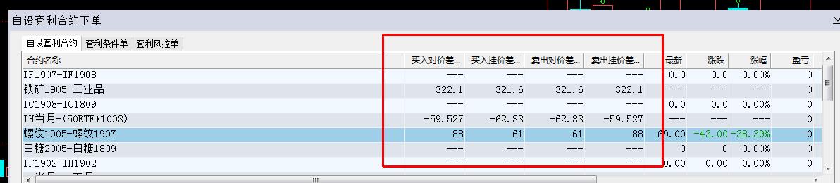 请问套利条件的的各个价差什么意思 (文华财经wh7睿期)投资者咨询:请问套利条件的的各个价差什么意思 (文华财经wh7睿期)来源:文华财经 日期:2018-8-23 14:50 我知道最新价应该是最新成交的价格的价差,但是对价差和挂价差什么意思,我要按照对手盘的报价价差来设立条件单是哪个价差啊? 谢谢技术人员回复日期:2018-8-23 15:04 对价,就是按照各腿的对手盘的价格计算的价差 举个例子:买入螺纹1905卖出螺纹1907.那么就是按照螺纹1905的卖一价和1907的买一价的价差计算的 挂价,就是按照各腿挂价来计算的 还是上面的例子就是按照1905的买一价和1907的卖一价计算的 您的思路使用对价差就可以了 或者可以直接查看下面界面截图这里直接对比的