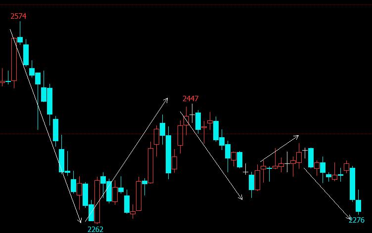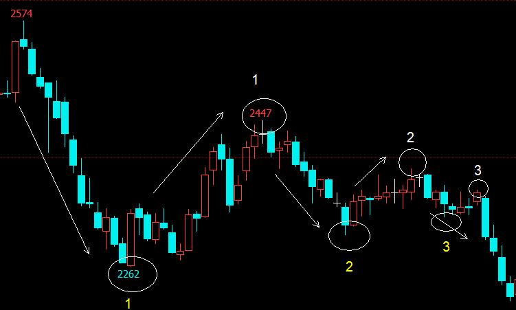 价格一路下跌形成低点1,回调至高点1,下跌至低点2,回调至高点2,下跌至低点3,回调至高点3,然后继续向下突破,硬性规定是:回调的高点规定在3个以上然后每一个高点都低于上一个高点,下跌的低点(包括第一个最低点),有3个以上,并且每一个低点都高于上一个低点,这个是最普通最常规的k线形态,但是写起来的时候如何定义高点和低点我实在想不出来,因为在k线形成的过程种会有临时高点和临时低点。