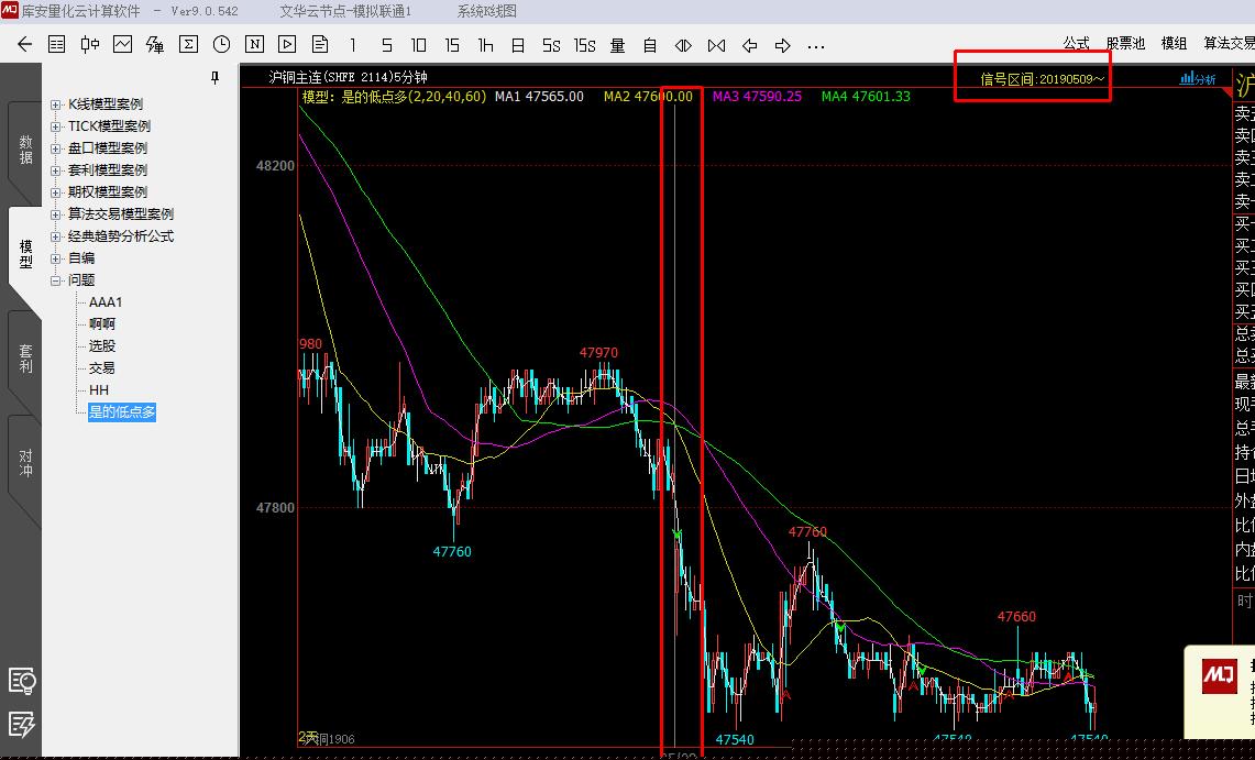 问下信号计算起始时间 (文华财经wh9)投资者咨询:问下信号计算起始时间 (文华财经wh9)来源:文华财经 日期:2019-5-9 20:21 MQ中,比如设置信号计算起始时间和结束时间都设置成2019年5月9日,是不是就执行一次计算?我的算法是计算250周期的数据,为啥我在2014年的K线上任然看到信号?技术人员回复日期:2019-5-9 20:33 我们本地查看是正常的 即使调整了信号计算时间,也仍然只计算5月9日的 您可以在K线图上看到信号计算开始的竖线的 还有疑问,截图我们看下现象