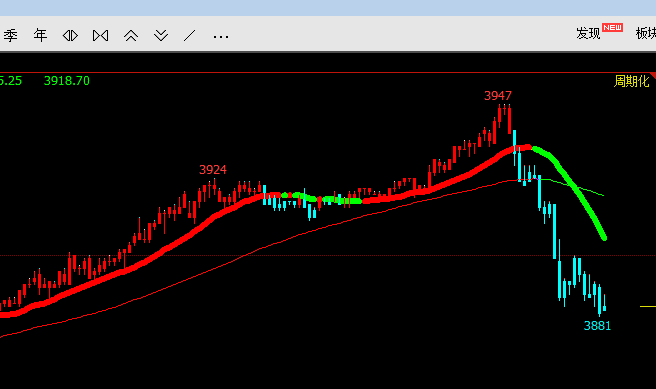 //FILLRGN(C<MA5&&MA2<MA3,MA2,MA3,COLORCYAN);//价格在20周期均线之下,10周期线小于20周期线时用绿色填充