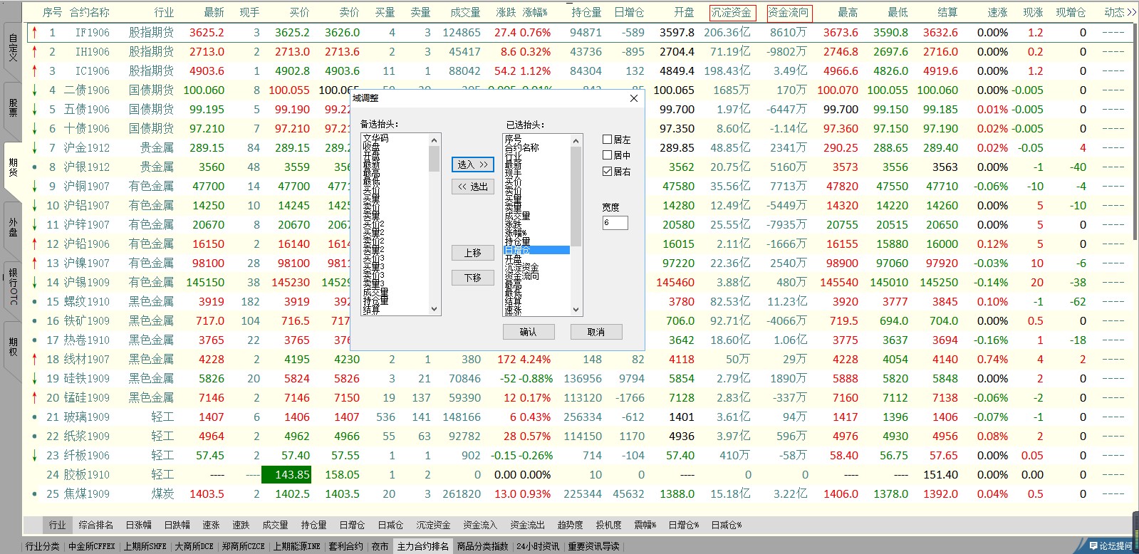 主力合约板块,截图看下,要显示多个抬头的数据,比如沉淀资金、资金流向等