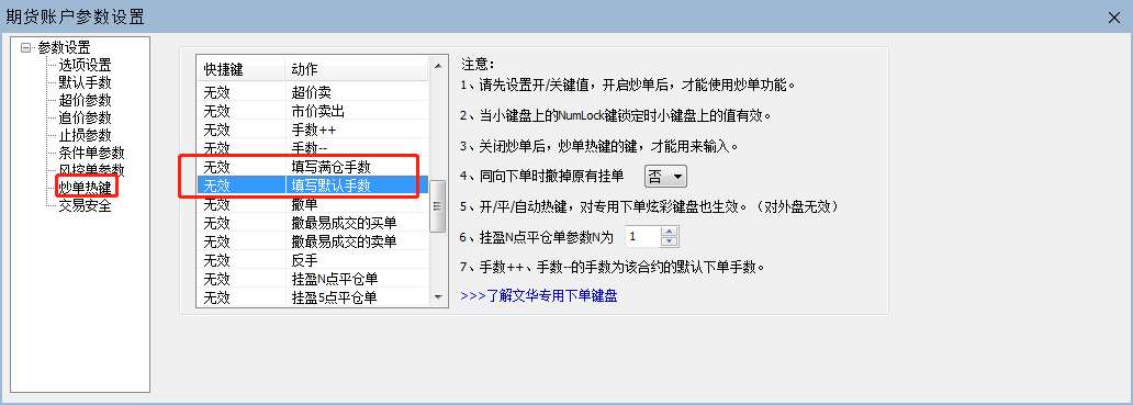 默认手数按百分比设置炒单热键下单 (文华财经wh7睿期)投资者咨询:默认手数按百分比设置炒单热键下单 (文华财经wh7睿期)来源:文华财经 日期:2019-5-21 14:25 默认手数按百分比设置后炒单热键下单不起作用? 技术人员回复日期:2019-5-21 14:31不支持手数按百分比下单的因为手数可能开仓,也可能平仓,百分比计算的不一定准确,反而浪费时间的 炒单热键其他的手数设置方式的,比如默认手数下单,或者满仓手数下单,您可以操作试下投资者咨询:默认手数按百分比设置炒单热键下单 (文华财经wh7睿期)来源:文华财经 日期:2019-5-21 14:25 在哪里设置满仓手数下单?技术人员回复日期:2019-5-21 14:48 参考链接位置设置: 另外,炒单各个功能含义,参考wh6说明书介绍: https://www.wenhua.com.cn/new_guide/Wh6/jy3.html