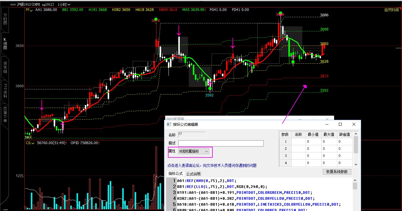 KTEXT(SC&&COUNT(SC,BARSLAST(JC))=1&&NN=1||COUNT(SC,0)=1 ,-Q1,REF(H,Q1),1,COLORMAGENTA,'↓'),FONTSIZE50;