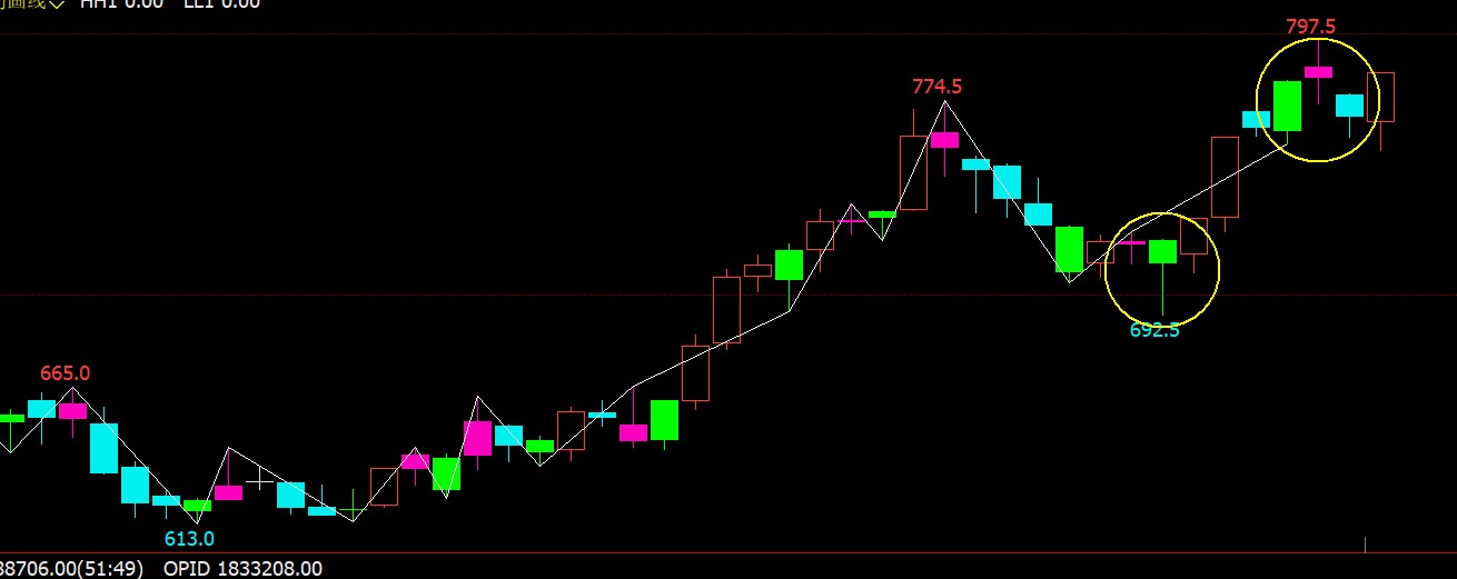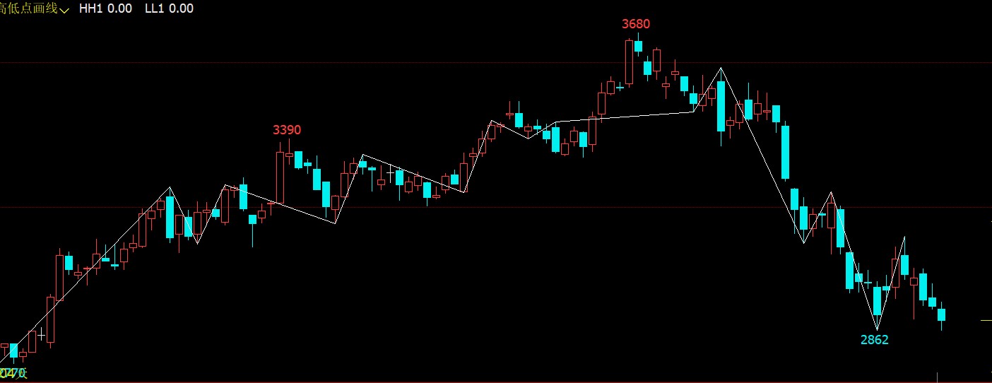 请教一下怎么自动画线,最高点比两边K线的最高点都高称为短期高点,最低点比两边的K线最低点都低为短期低点,从短期高点画线到短期低点