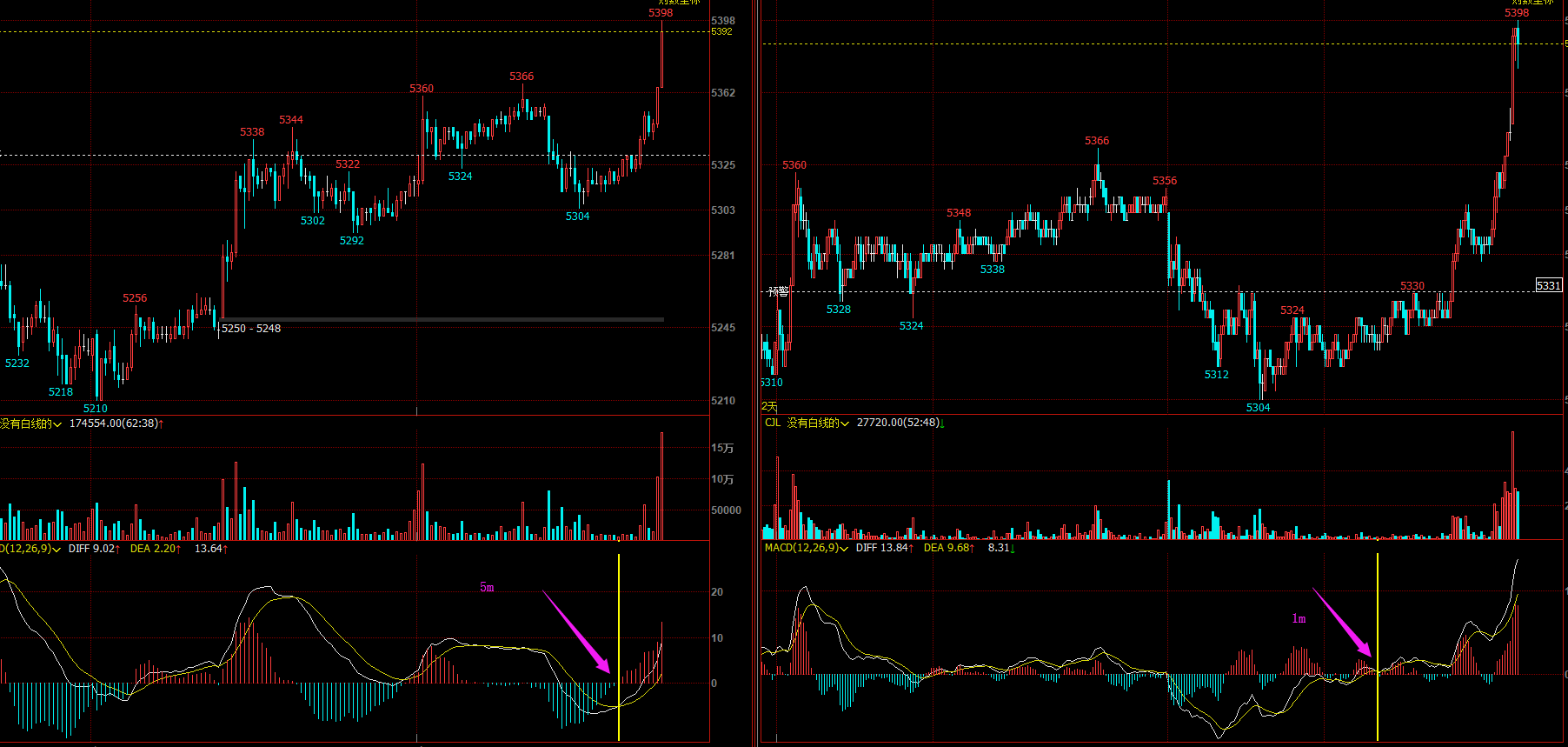 当MACD金叉(或死叉)时,画坚线,同时小周期也画坚线