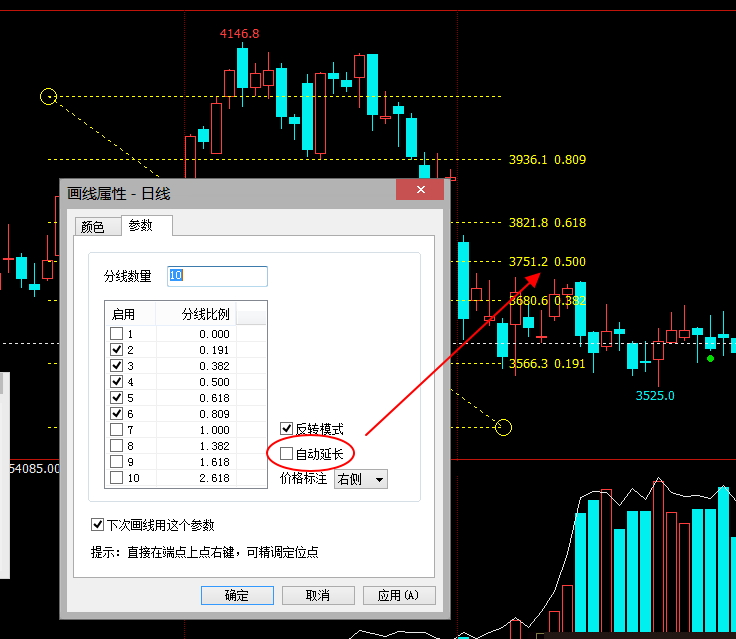 黄金分割横排显示股价能同时显示百分比吗,有时不知道是0.236‘0.382’还是多少 (文华财经WH6赢顺V6.7)投资者咨询:黄金分割横排显示股价能同时显示百分比吗,有时不知道是0.236‘0.382’还是多少 (文华财经WH6赢顺V6.7)来源:文华财经 日期:2019-6-18 12:34 黄金分割横排显示股价能同时显示百分比吗,股价和百分比如0.382% 2238 ,50% 2250, 61.8% 2270等,容易判断在哪里有强支撑压力 技术人员回复日期:2019-6-18 12:41 右键》画线属性,取消自动延长,可以在价格后面显示分线百分比 不过如果K线压缩太密就会自动隐藏的