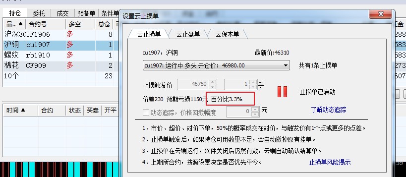 关于拖动止损单 (文华财经WH6赢顺V6.7)投资者咨询:关于拖动止损单 (文华财经WH6赢顺V6.7)来源:文华财经 日期:2019-6-18 11:23现在软件,拖动止损点,会有价差显示用户其实最关心的是止损多少百分比,如-1%能不能拖动止损时,同时显示百分比,这样方便交易 技术人员回复日期:2019-6-18 11:33 显示价差更直观,所以拖动止损线时优先考虑大多数用户的用法, 您的需求,可以手动添加止损单,在下单板》持仓栏》设置云端止损单这里可以查看到百分比
