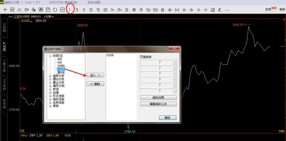 在1分钟K线图右键》叠加技术指标,选入K线形态下的CLOSE