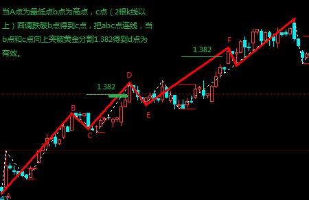 当A点为最低点b点为高点,c点(2根k线以上)回调跌破b点得到c点,把abc点连线,当b点和c点向上突破黄金分割1.382得到d点为有效。以图片中红色实线为例