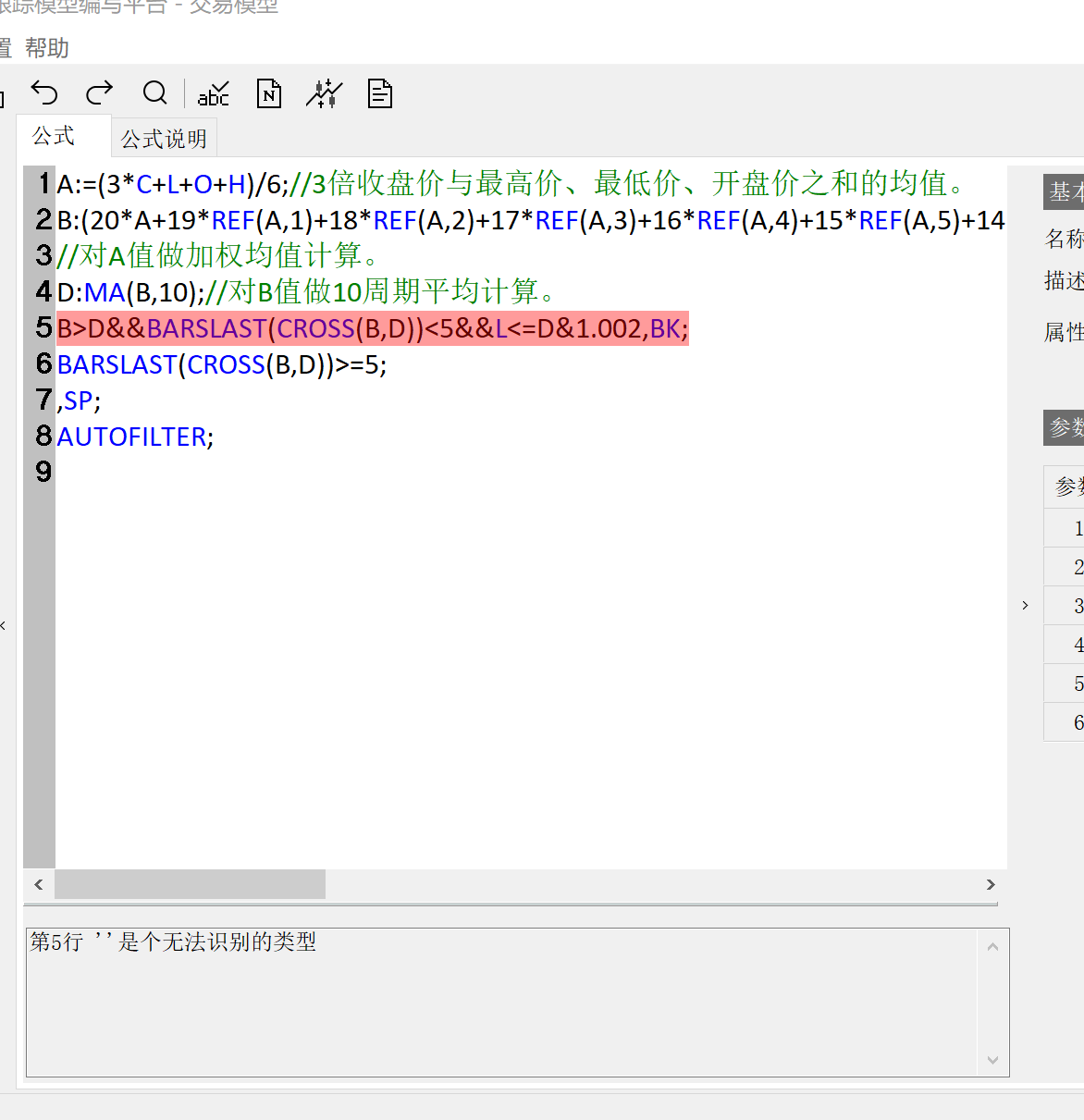 老师,这个穿越语句 (文华财经WH8赢智V8.2)投资者咨询:老师,这个穿越语句 (文华财经WH8赢智V8.2)来源:文华财经 日期:2018-8-23 8:36 老师,这个穿越语句,我想表达从B上穿D的位置,离开了最多5根K线,下面的语句加载提示是错误的,怎样修改呢?BARSLAST(BARSLAST(CROSS(B,D))<5); 技术人员回复日期:2018-8-23 8:37 BARSLAST(CROSS(B,D))<5; 就行 表达的是距离上一次b上穿d的距离小于5投资者咨询:老师,这个穿越语句 (文华财经WH8赢智V8.2)来源:文华财经 日期:2018-8-23 8:36 技术人员回复日期:2018-8-23 8:42 D&1.002 哪里 少了个&