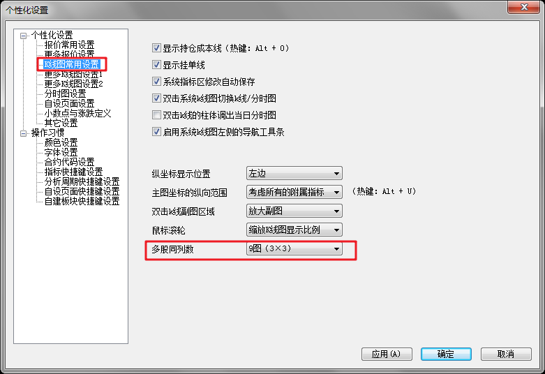 请问单合约 多周期,怎么调成9画面? (文华财经WH6赢顺V6.7)投资者咨询:请问单合约 多周期,怎么调成9画面? (文华财经WH6赢顺V6.7)来源:文华财经 日期:2018-8-23 8:30 请问单合约 多周期,怎么调成9画面?技术人员回复日期:2018-8-23 8:34 使用多周期同列功能,快捷键ctrl+X 软件有上角》个性化》个性化设置》K线图常用设置,如图设置为9图就可以了 另外,您刚开始接触软件,可以在软件右上角》帮助》软件说明书,了解一下软件的功能和使用方法