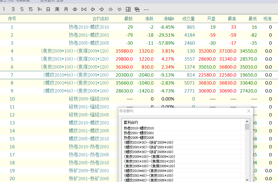 周五早上开盘后,增加了一些套利对,对价差表做了改动,后来几个套利对就不显示了重新弄工作量大