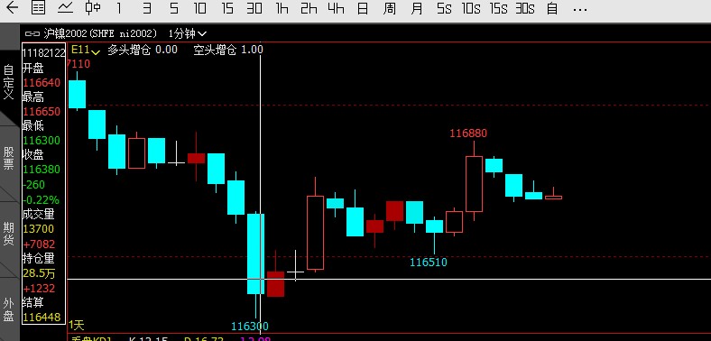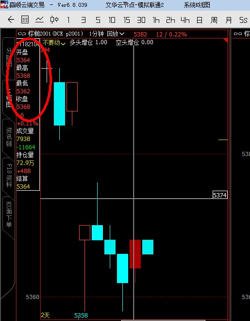 p2001的1分钟数据的21:04分那根复盘时出现了收盘价低于开盘价的时候显示为红色