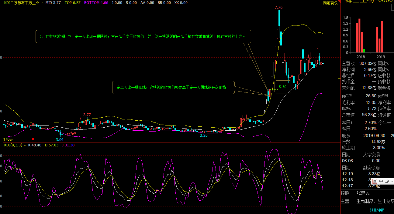 条件2:第二第出现一根阳K线,这一根日K线的收盘价格要高于前天第一根阴K日线的开盘价格,并且这一根K线的收盘价格要高于布林线上轨线的点位价格。