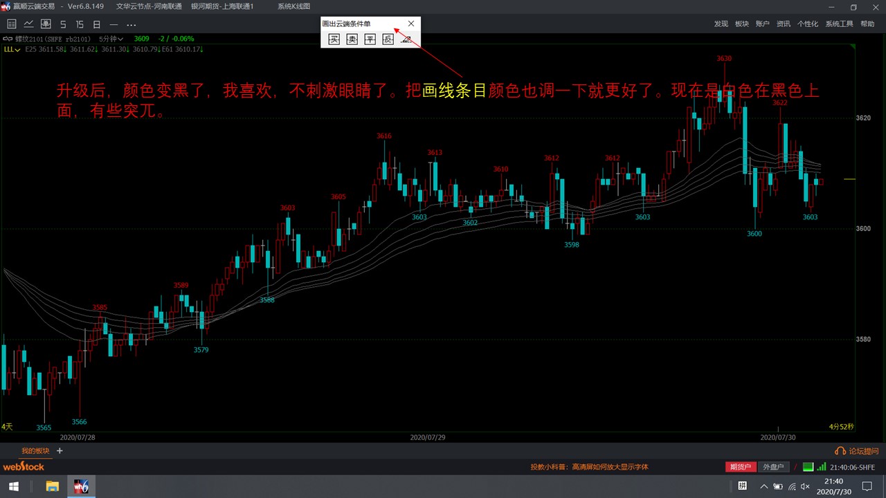 颜色调整调整 (文华财经WH6赢顺V6.8)投资者咨询:颜色调整调整 (文华财经WH6赢顺V6.8)来源:文华财经 日期:2020-7-30 21:47 颜色调整技术人员回复日期:2020-7-30 21:50 可以将常用的画线工具放到工具条显示,颜色就是一致的 个性化-》个性化设置-》画线分析,取消勾选 画线工具箱按钮直接调用画线面板 之后如图设置