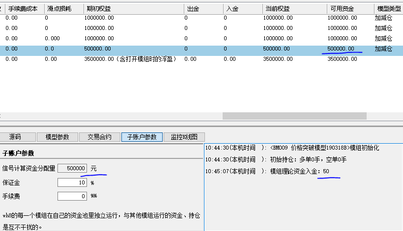 当刚开始加载一个策略到某个合约时,在子账户资金设置中设置100万资金,初始化以后,模组会使用100万资金从最开始的K先开始回测。这样会导致到了当前的k线时,模组中显示的可用资金与希望设置的100万元有不同。实际我的要求肯定是子账户资金在当下k线是100万。要解决这个问题,就需要手动进行出入金,调整模组中的可用资金。