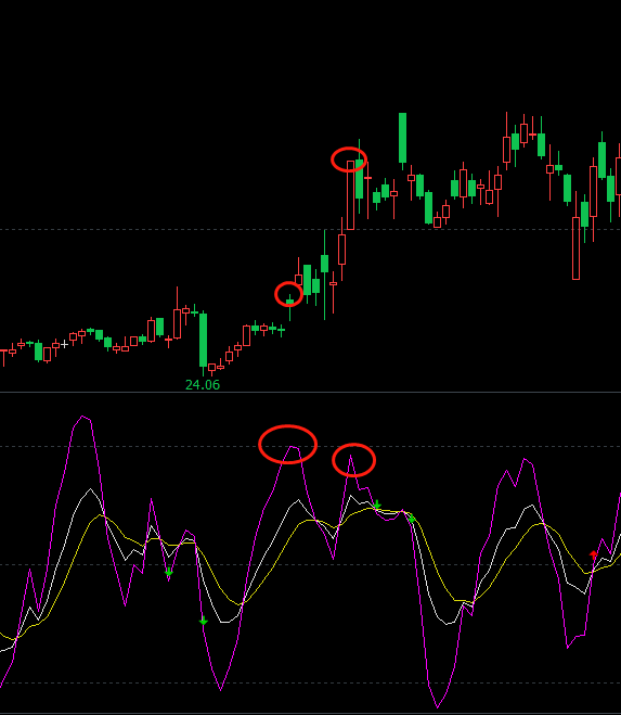 例如J值的低点和下一个低点对应的价格 产生背离 在J上标记箭头