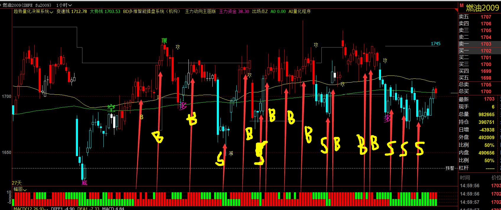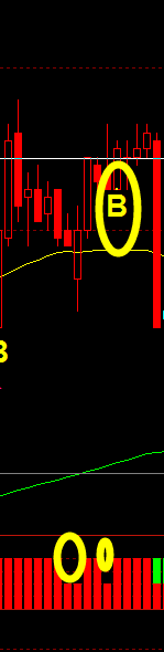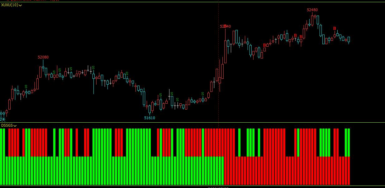 当幅图最下层为红柱时,幅图上层出现红柱在主图K线标注B信号,上层出现绿色柱子不用管他;