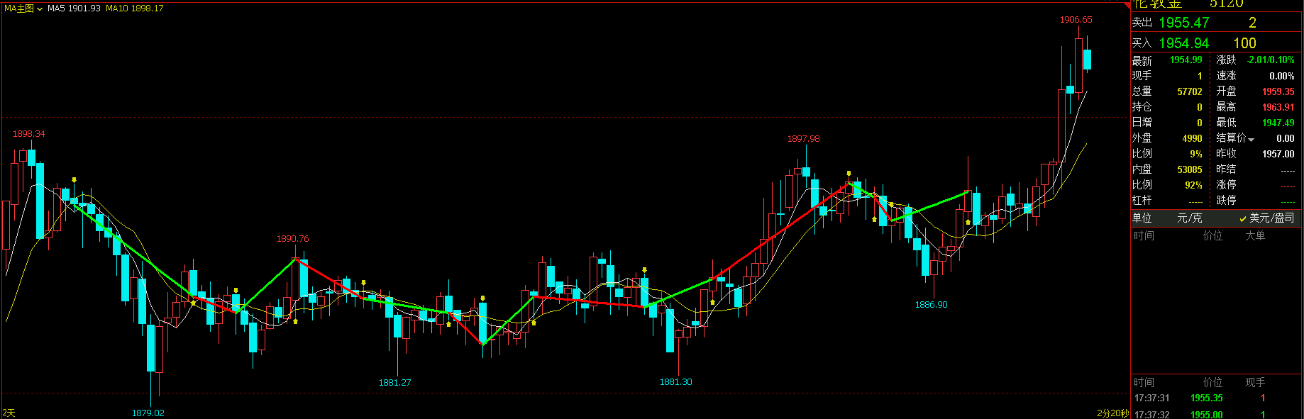 DRAWTEXT(CROSSDOWN(MA5,MA10),H,'卖'),COLORGREEN;