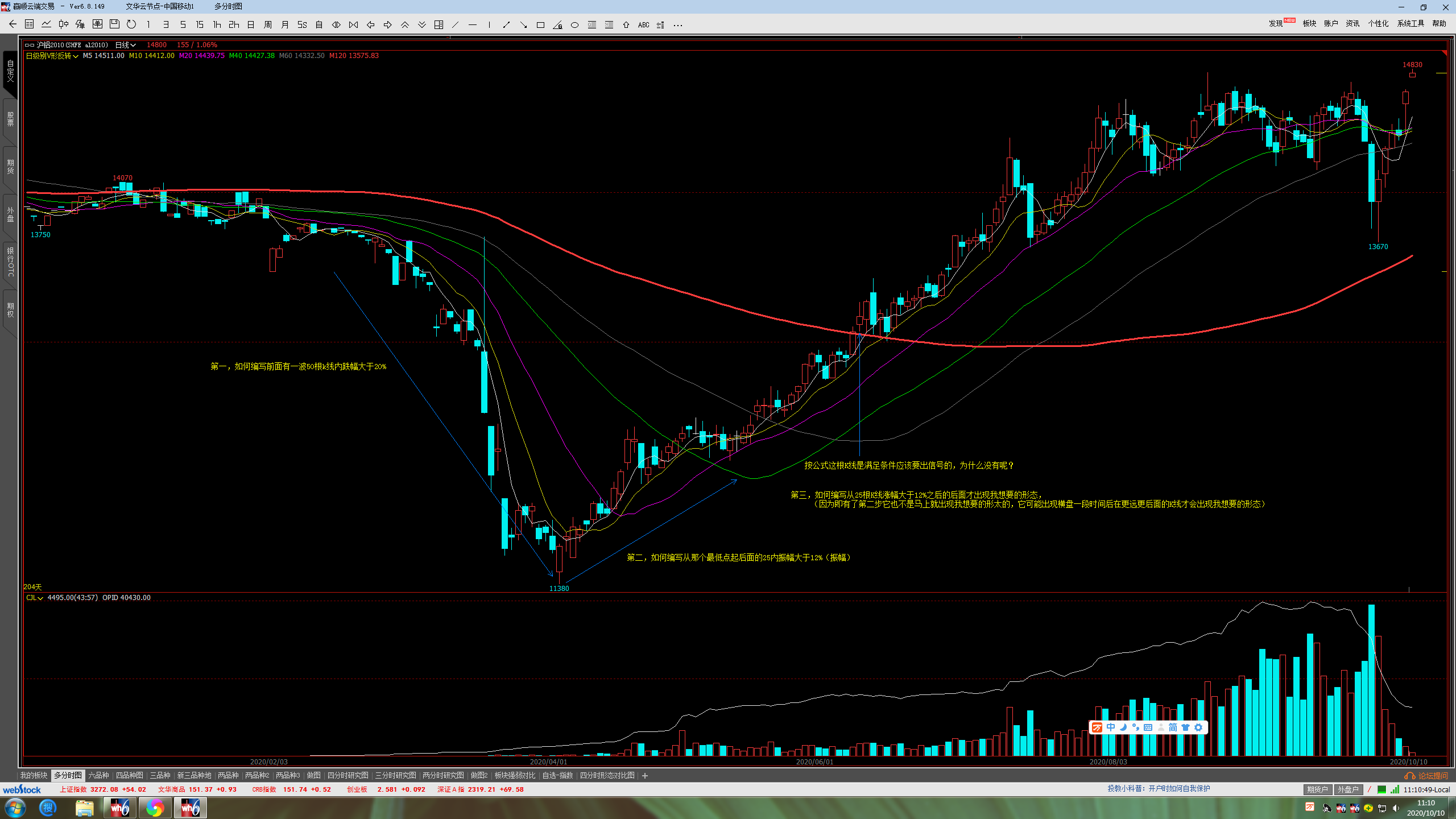 3、在出现25周期反弹振幅大于12%之后,接着有3个必备条件:1、MA5,MA10,MA20,MA40,MA60,必须顺序多头排列。2、价格要站上MA120线。3、必须是阳线。