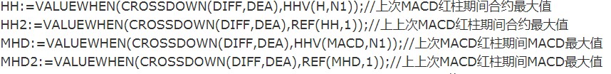 HH:=VALUEWHEN(CROSSDOWN(DIFF,DEA),HHV(H,N1));//上次MACD红柱期间合约最大值