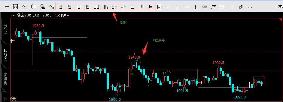 1、时间周期:根据选择的时间周期切换,如选择3分钟、5分钟、15分钟、30分钟。。。等K线图