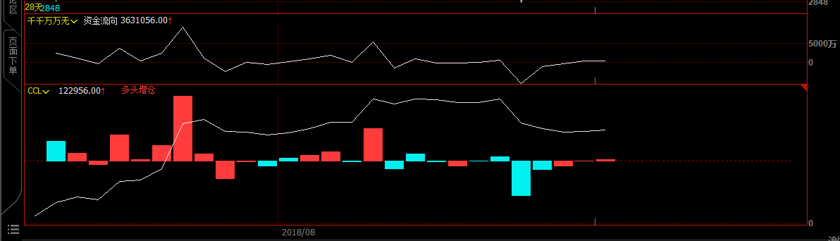 列表页面资金流向显示在K线页面 (文华财经WH6赢顺V6.7)投资者咨询:列表页面资金流向显示在K线页面 (文华财经WH6赢顺V6.7)来源:文华财经 日期:2018-8-22 9:10 能不能实现,最好跟CCL副指标一起技术人员回复日期:2018-8-22 9:14 您的思路需要编写自编指标实现,加载对比查看就可以了 编写参考: N:=BARSLAST(DATE<>REF(DATE,1))+1; 保证金比例:=0.05;//假设保证金比例以5%为例,您需要针对具体合约来设置资金流向:(OPI*C-REF(OPI,N)*REF(C,N))* UNIT* 保证金比例; 投资者咨询:列表页面资金流向显示在K线页面 (文华财经WH6赢顺V6.7)来源:文华财经 日期:2018-8-22 9:10 我说的是把这个里面的资金流向,图片1,改到副指标ccl图片2上去技术人员回复日期:2018-8-22 9:35 不行的,CCL指标是后台处理过的指标,资金流向返回值和CCL相差很大 加载之后会压缩显示,您可以增加一个副图,对比查看,见下图