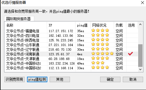 设置行情服务器 (文华财经)投资者咨询:设置行情服务器 (文华财经)来源:文华财经 日期:2020-10-9 16:47 最近一段时间点软件有时弹窗让设置行情服务器,发生几次了,这个应该是设置一次会自动保存吧,下面截图里我看好像没啥问题的 文件名:小qq截图20201009164307.png技术人员回复日期:2020-10-9 16:53 设置过后,正常是会自动保存的您的情况应该是当时网络不稳定,之前选择的服务器登录不上,所以才提示您重新选择选择ping值最小的服务器登录就可以了投资者咨询:设置行情服务器 (文华财经)来源:文华财经 日期:2020-10-9 16:47 嗯嗯,谢谢梧桐老师,我这宽带可是正经八百的联通营业厅申请安装的!技术人员回复日期:2020-10-9 17:10 可能是网络偶尔的波动,不会经常提示重新选择服务器的。 也可以把路由器拿的近一些,或者用网线直连,效果会比较好。