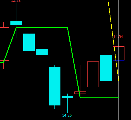 周收盘价:IF(PERIOD=8,REF(C,BARSLAST(ZO)+1),NULL),COLORGREEN,LINETHICK3;