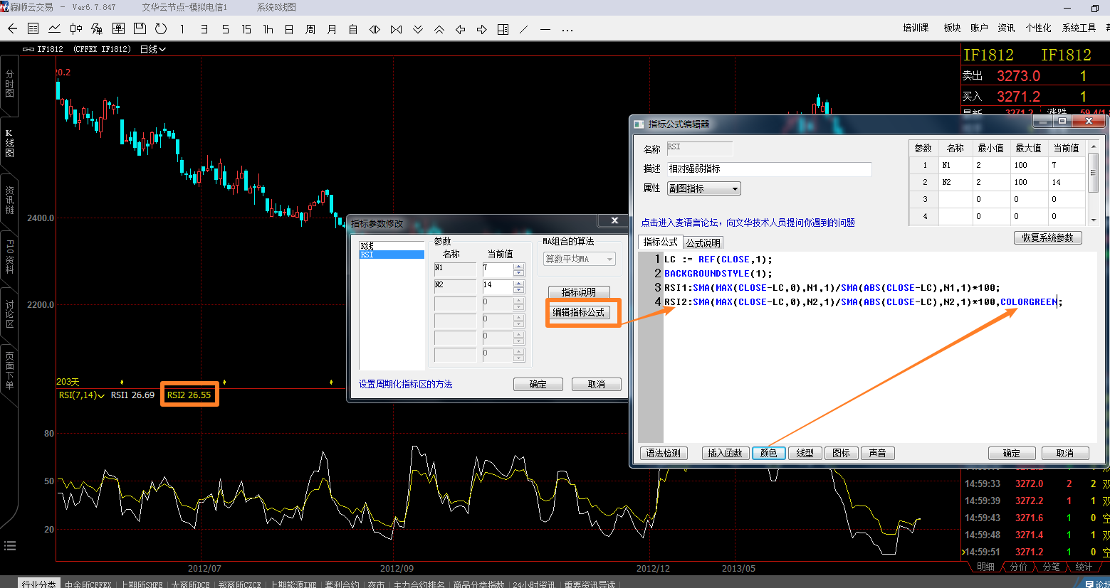 RSI...... (文华财经WH6赢顺V6.7)投资者咨询:RSI...... (文华财经WH6赢顺V6.7)来源:文华财经 日期:2018-8-22 0:21 黄色线怎么改绿色? 技术人员回复日期:2018-8-22 8:13RSI副图右键-设置指标参数-编辑指标公式,黄线对应的是RSI2,鼠标放在该行公式结尾分号前面,插入颜色