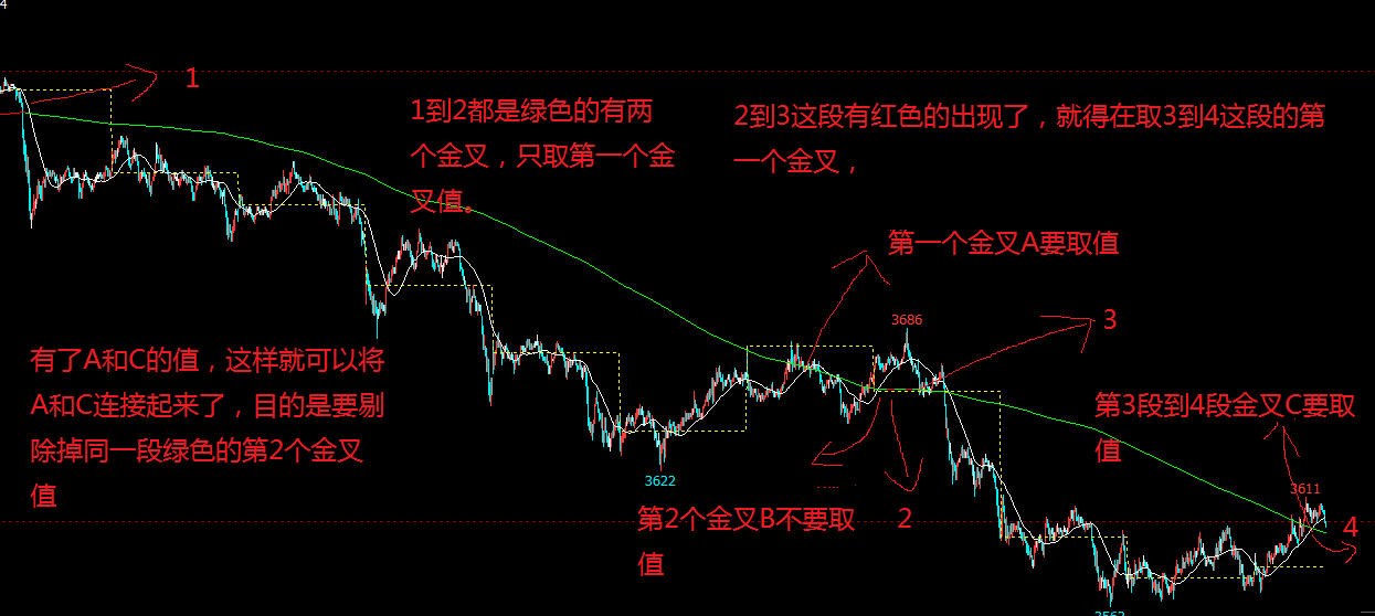 条件1:在MM5为0时,MA5绿色的时候,在这同一个绿色条件下,指取第一个MA1上穿MA5取金叉MA5值,后面有可能在下穿上穿不取值,通俗说就是MA5下跌是绿色,上涨是红色,每次MA5绿色都取第一个金叉MA5值。