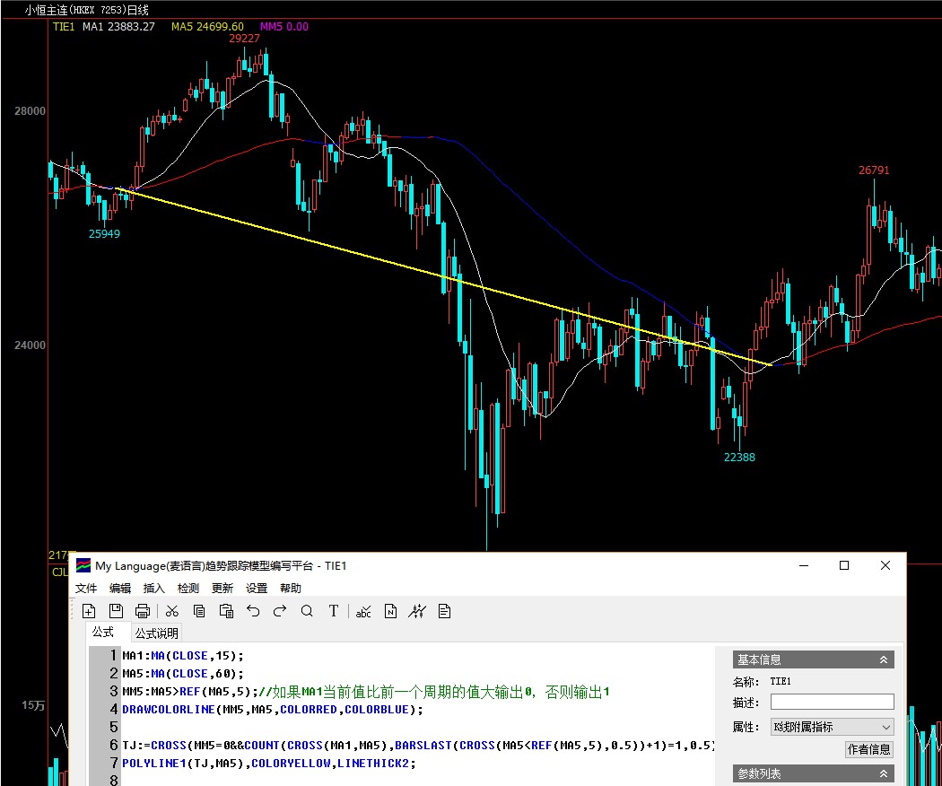 MM5:MA5>REF(MA5,5);//如果MA1当前值比前一个周期的值大输出0,否则输出1